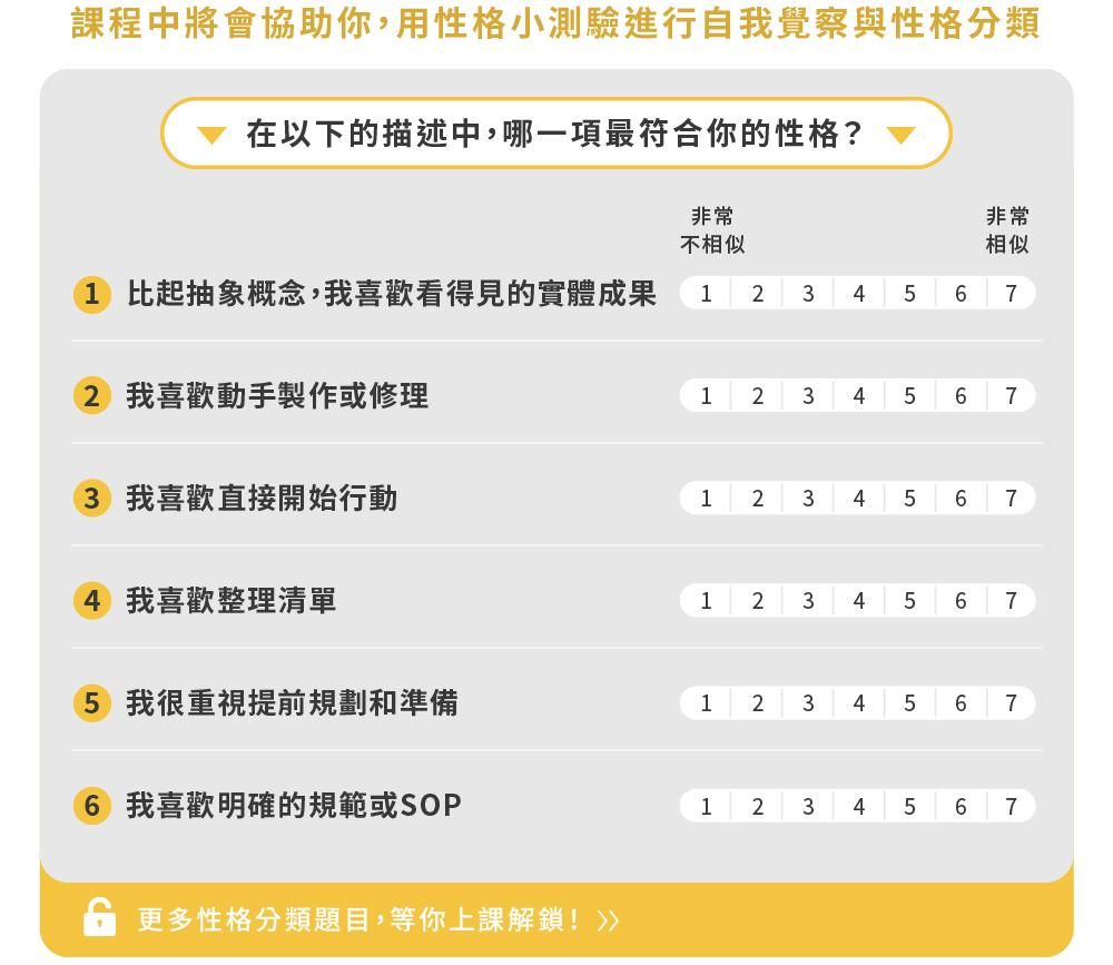 實際的調整項目,在課程中結合六大職業興趣的角色特質,都會有更完整舉例!