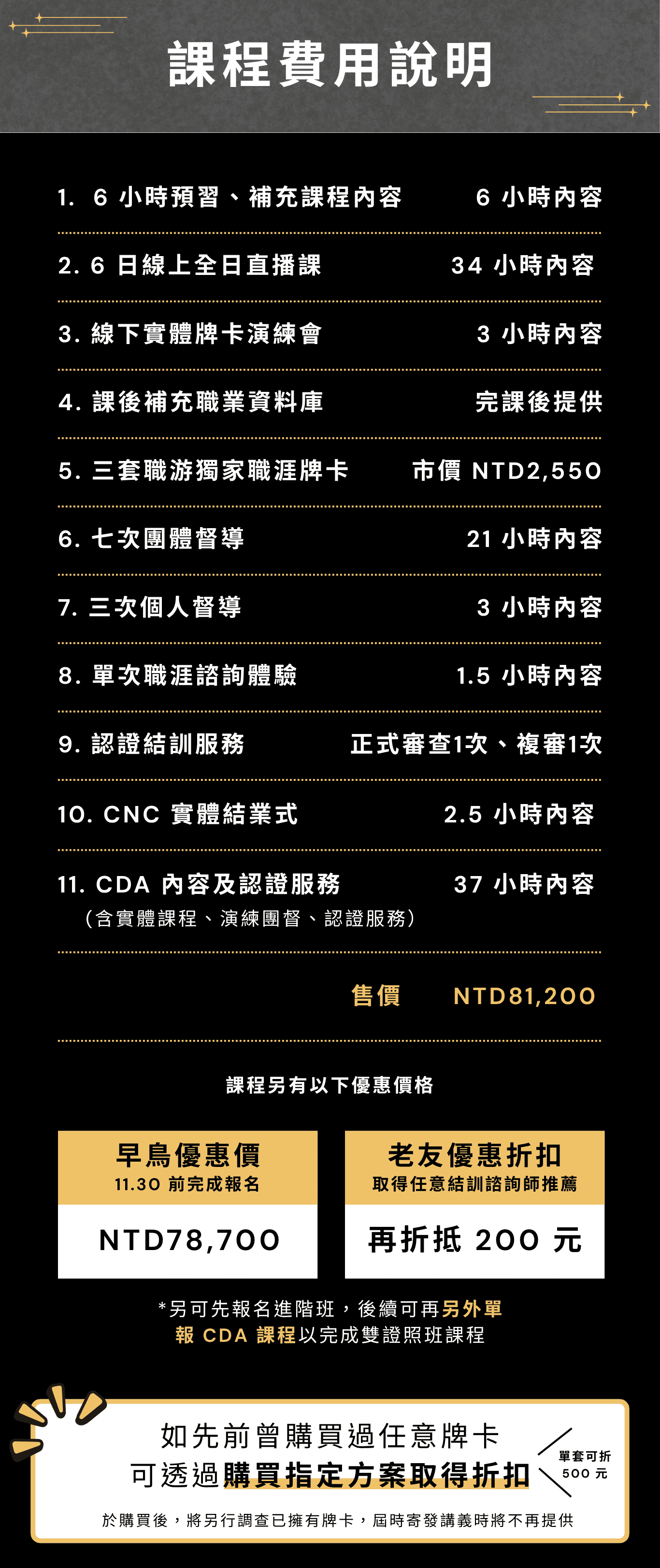 包含 2026 年國際雙證照班課程參與權限、全課程教材、全套職涯牌卡(職游旅人卡、職能盤點卡、價值導航卡各乙副),教材、牌卡、開課通知最晚於開課前 7 天寄發。