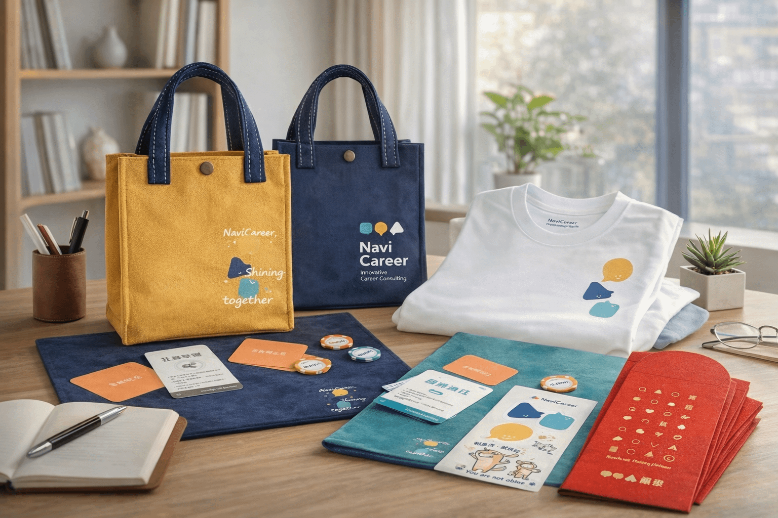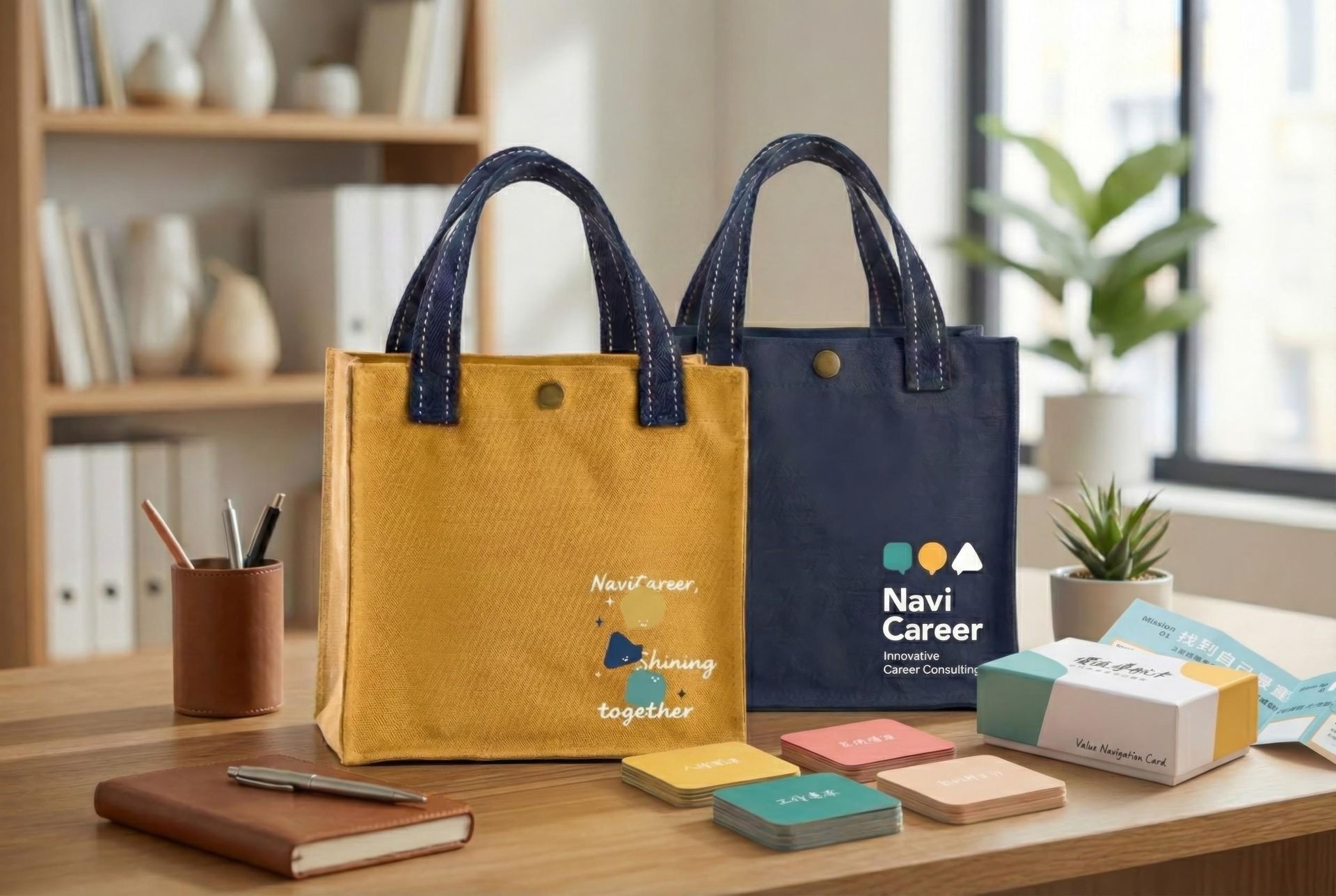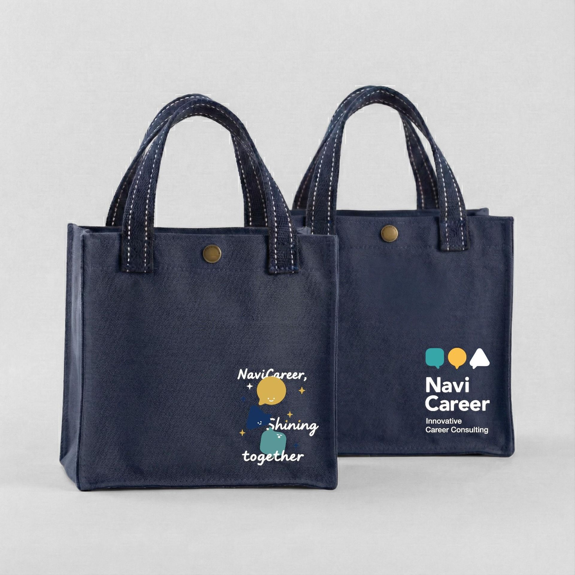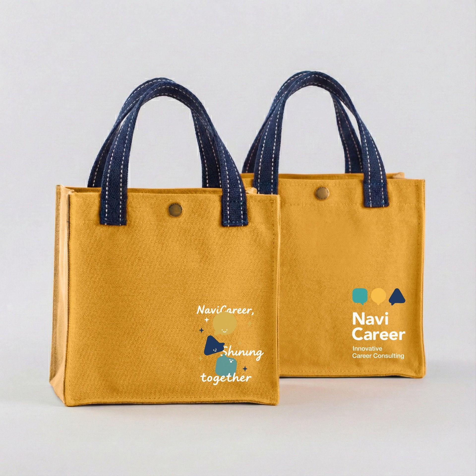 挺版小提袋,兩款配色(普魯士藍/芥黃)搭配職游識別圖樣與「Shining together」字樣,裝得下日常小物、筆記本、牌卡,也很適合活動外出帶著跑場。