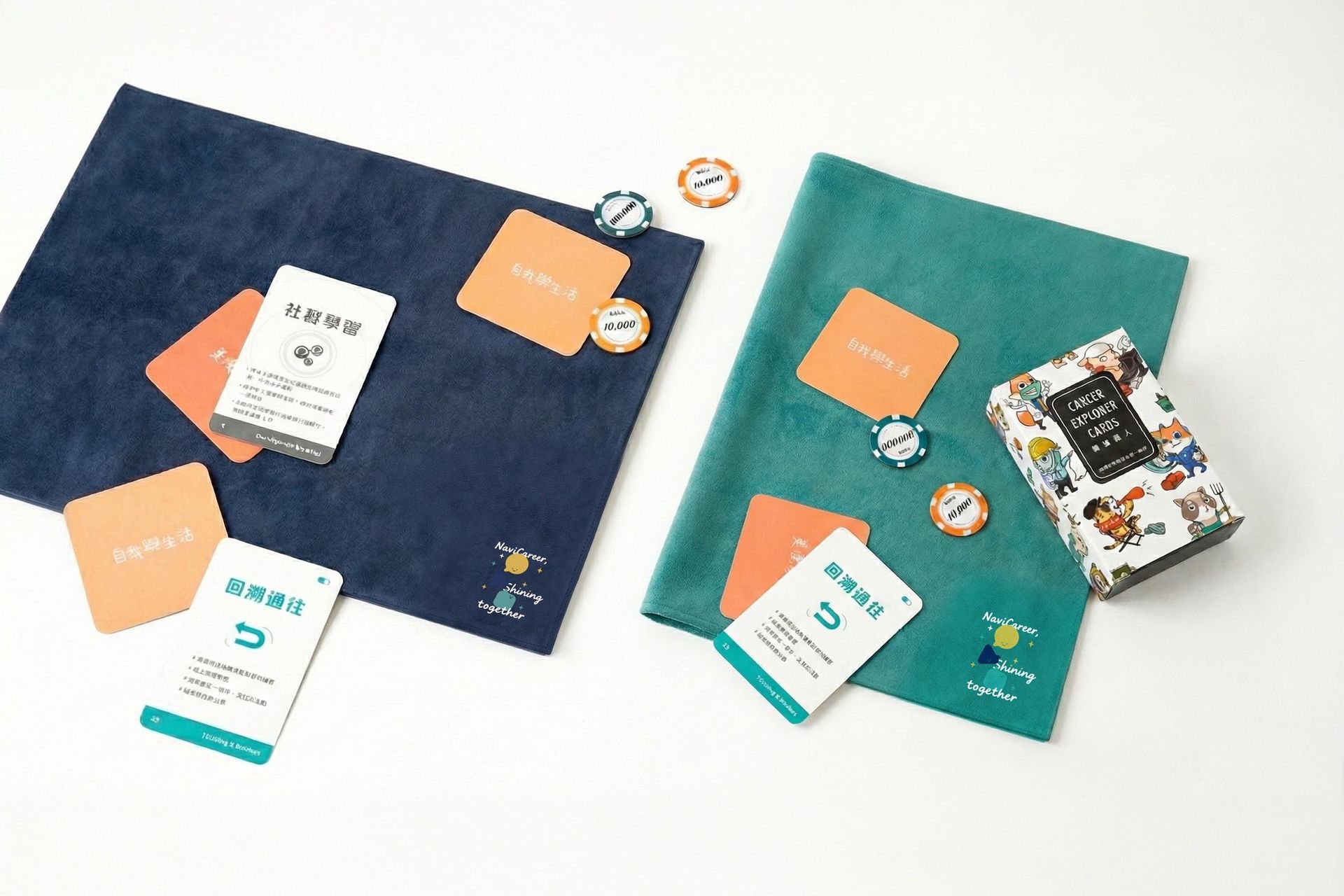 柔軟布面+五週年圖樣(普魯士藍/湖水綠兩色),增添在諮詢時,使用牌卡的儀式感,同步讓牌卡不易貼於桌面而不易翻卡,也讓其變為一個「開場的儀式」,提醒你穩下來、把空間留給對話。