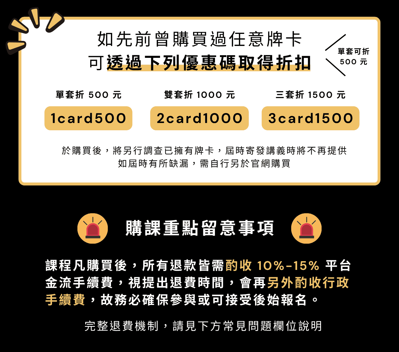 - 自線下實體牌卡演練會開始(超過 36 小時),恕不再受理退費。