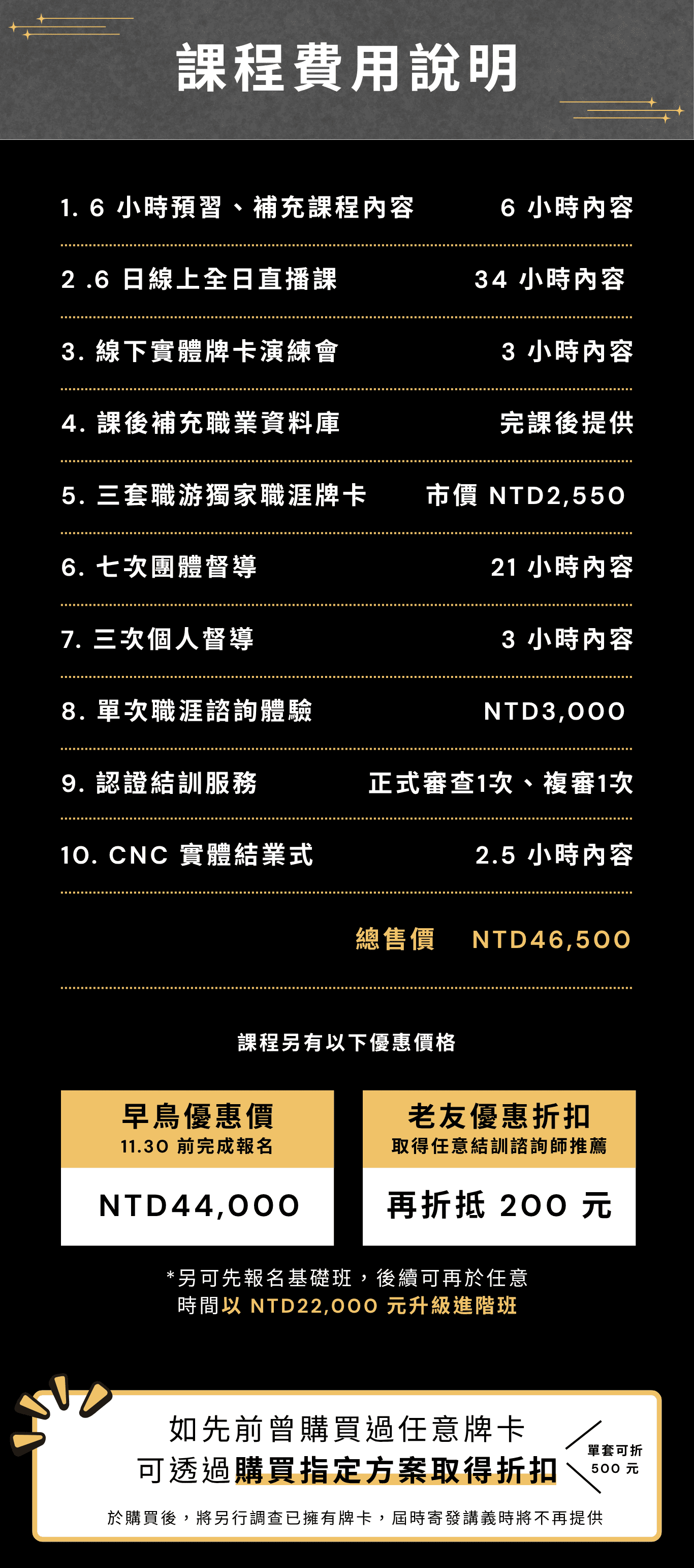 由於課程項目繁多,填寫報名表與繳費時,請留意報名項目是否正確,並如選購牌卡折抵方案,將不會寄出全套牌卡,如另有缺漏,需再透過官網另行訂購。