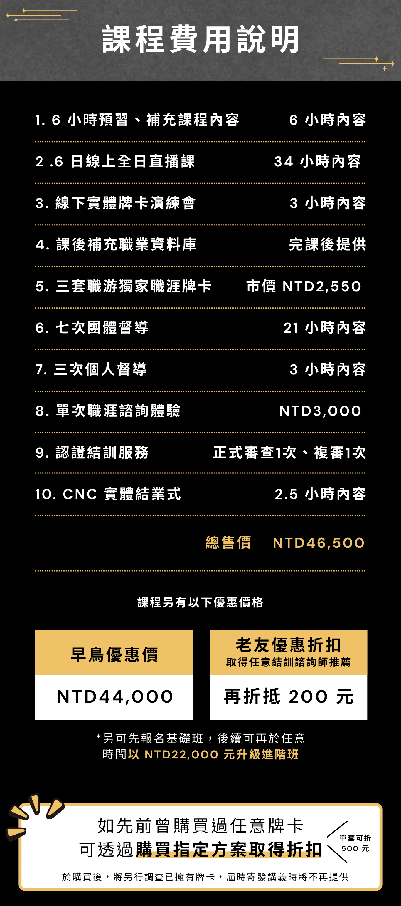 包含 2026 年第三梯進階班課程參與權限、全課程教材(共 6 本)、全套職涯牌卡(職游旅人卡、職能盤點卡、價值導航卡各乙副),教材、牌卡、開課通知最晚於開課前 7 天寄發。 * 務必請留意,於購課後如申請退費,將酌收 10-15% 金流手續費,及視申請退費時間另酌收行政手續費,詳情退費說明請見下方常見問題,請務必於確認可接受後始報名。
