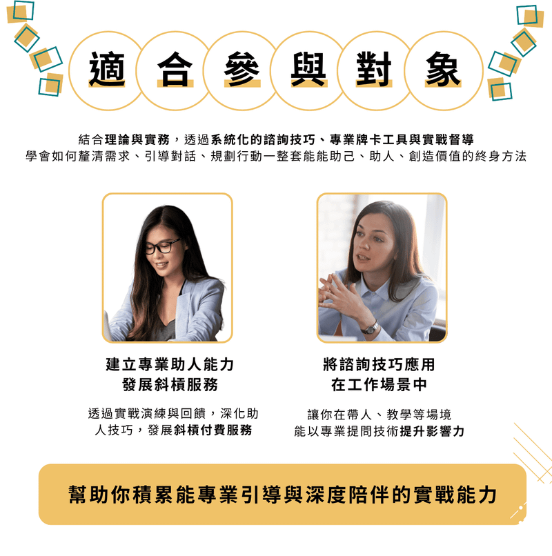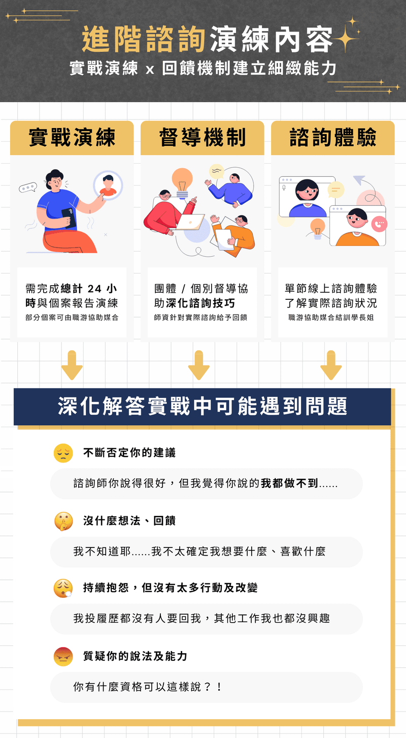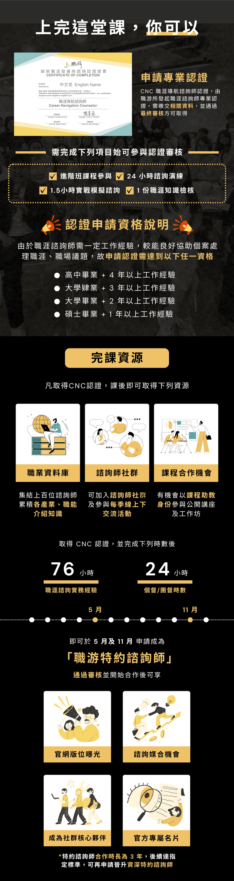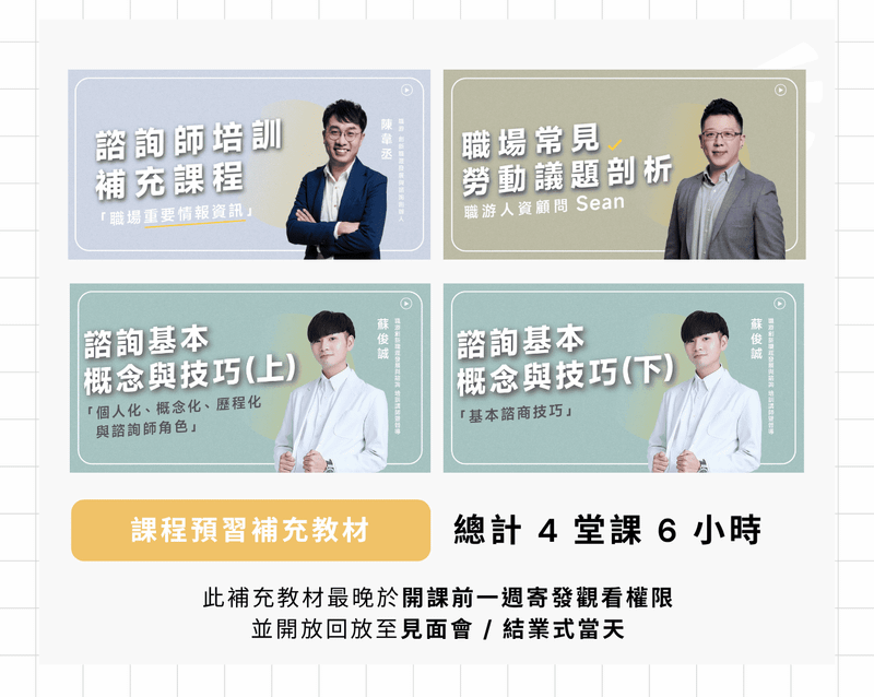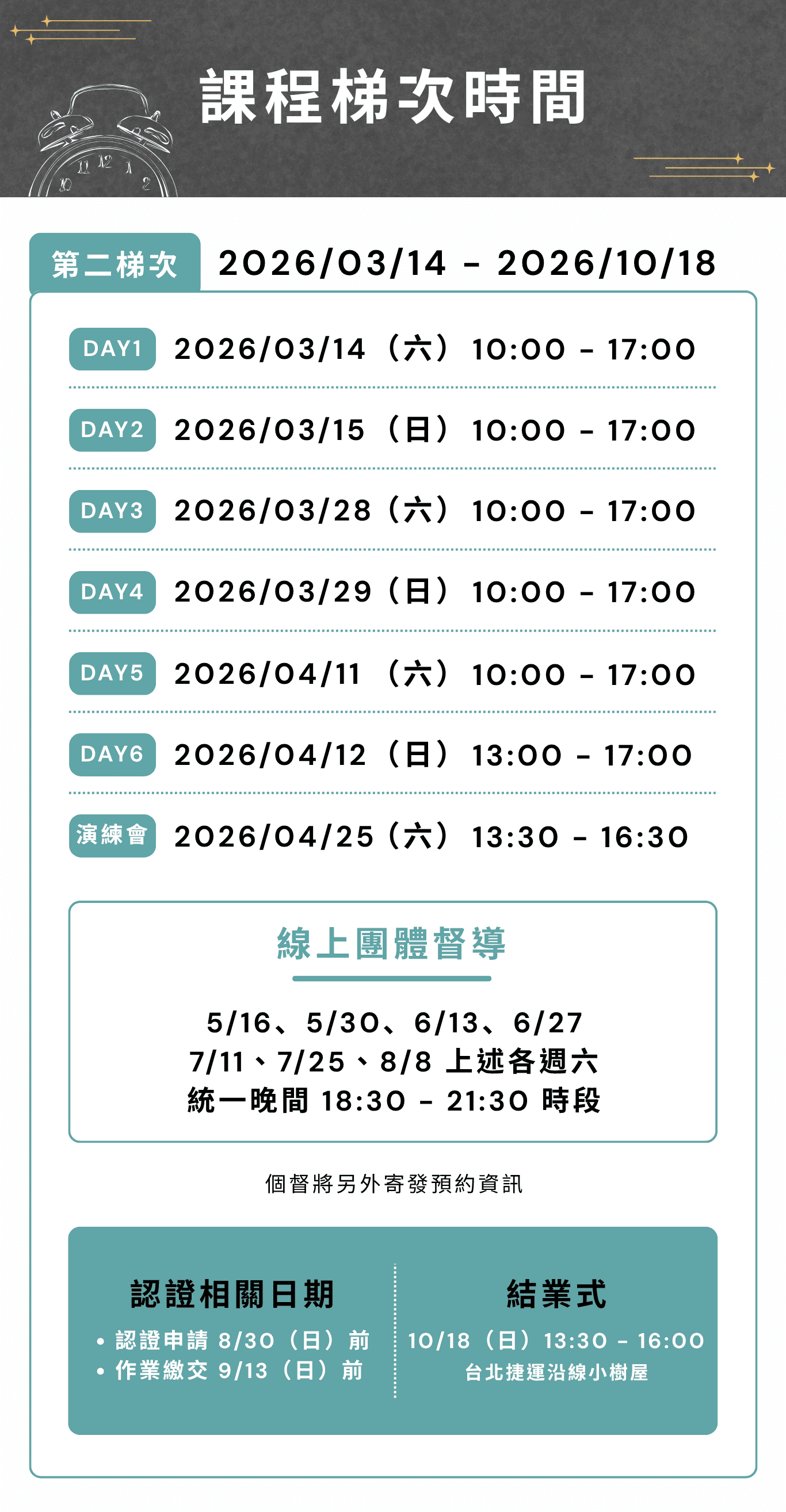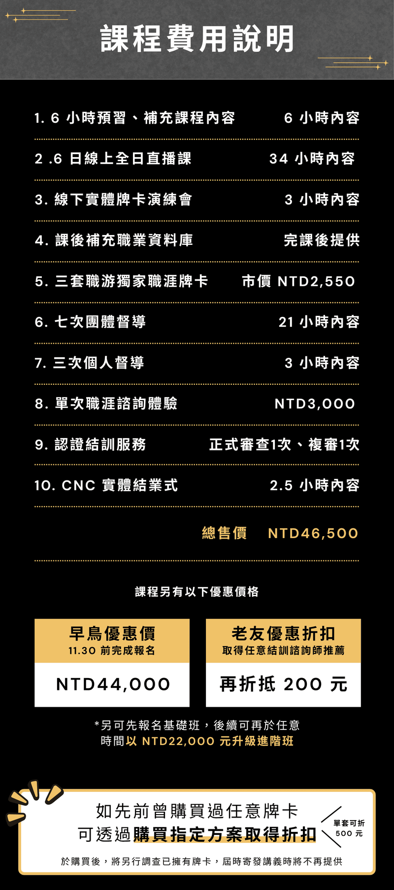 包含 2026 年第二梯進階班課程參與權限、全課程教材(共 6 本)、全套職涯牌卡(職游旅人卡、職能盤點卡、價值導航卡各乙副),教材、牌卡、開課通知最晚於開課前 7 天寄發。