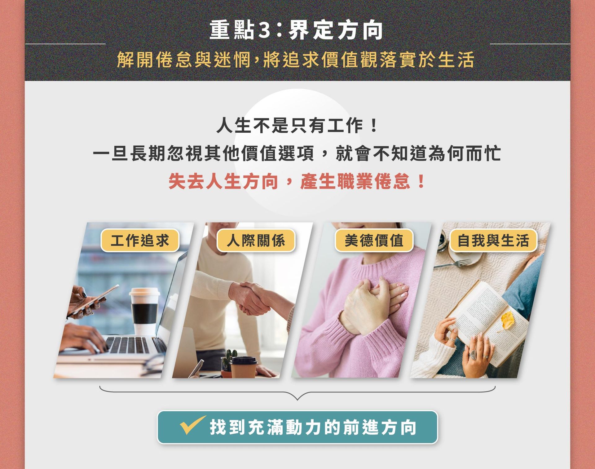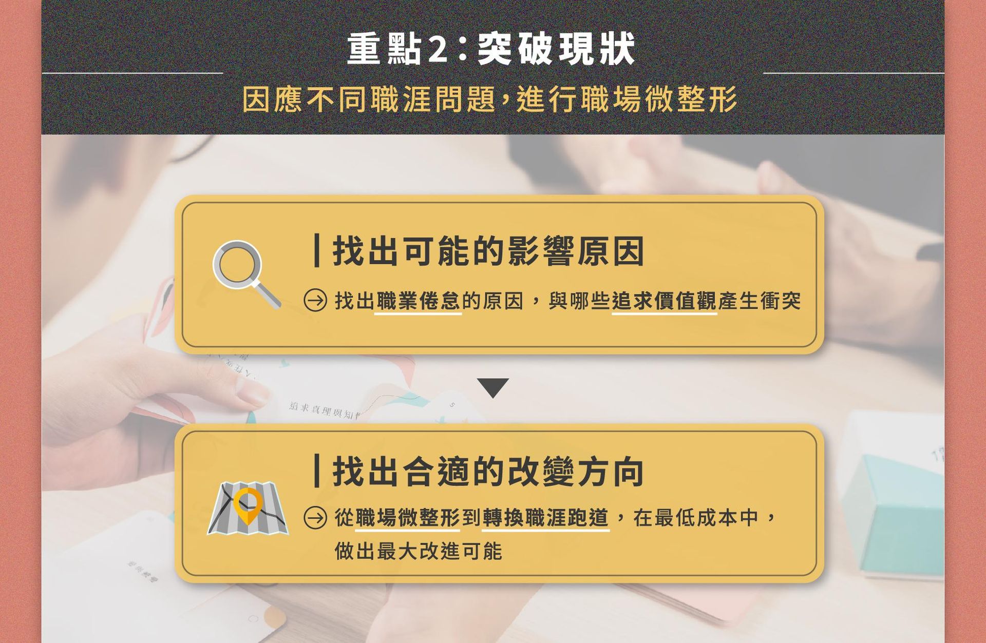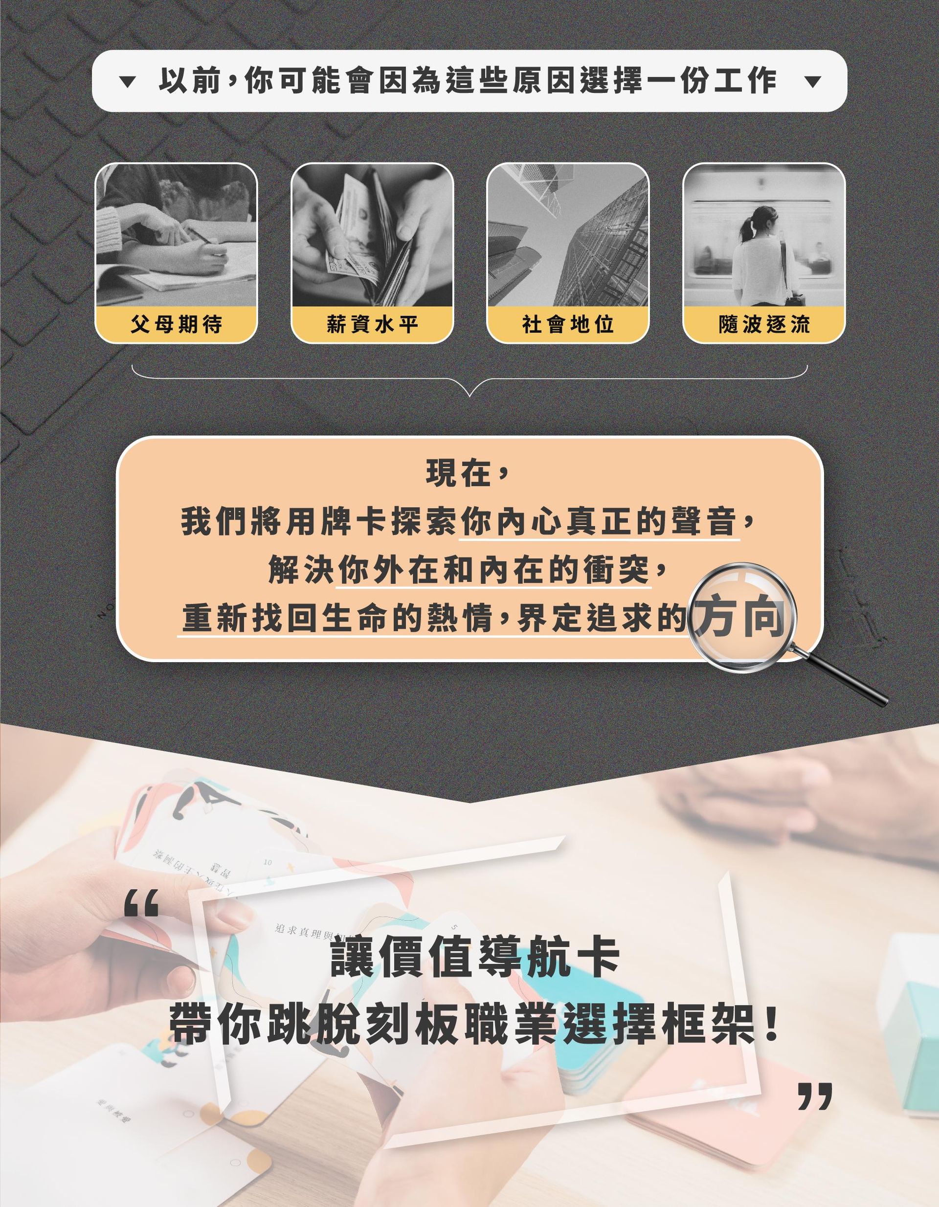 透過講師結合理論與實作的講解, 更加深入且靈活地掌握價值導航卡的應用,跟隨自我價值讓職涯不再失落徬徨!