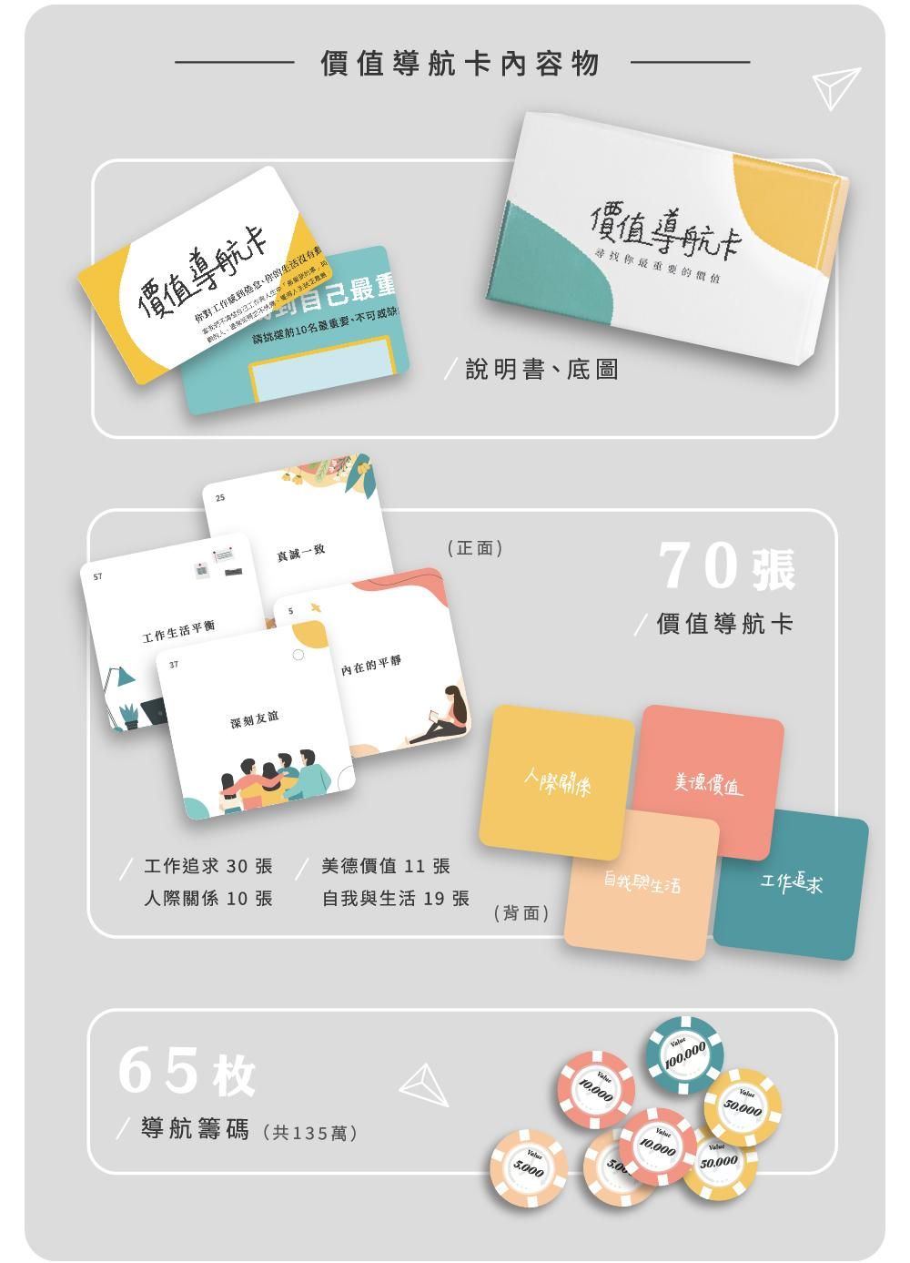 牌卡重量:職游旅人卡 308g、職能盤點卡 297g、價值導航卡 297g。